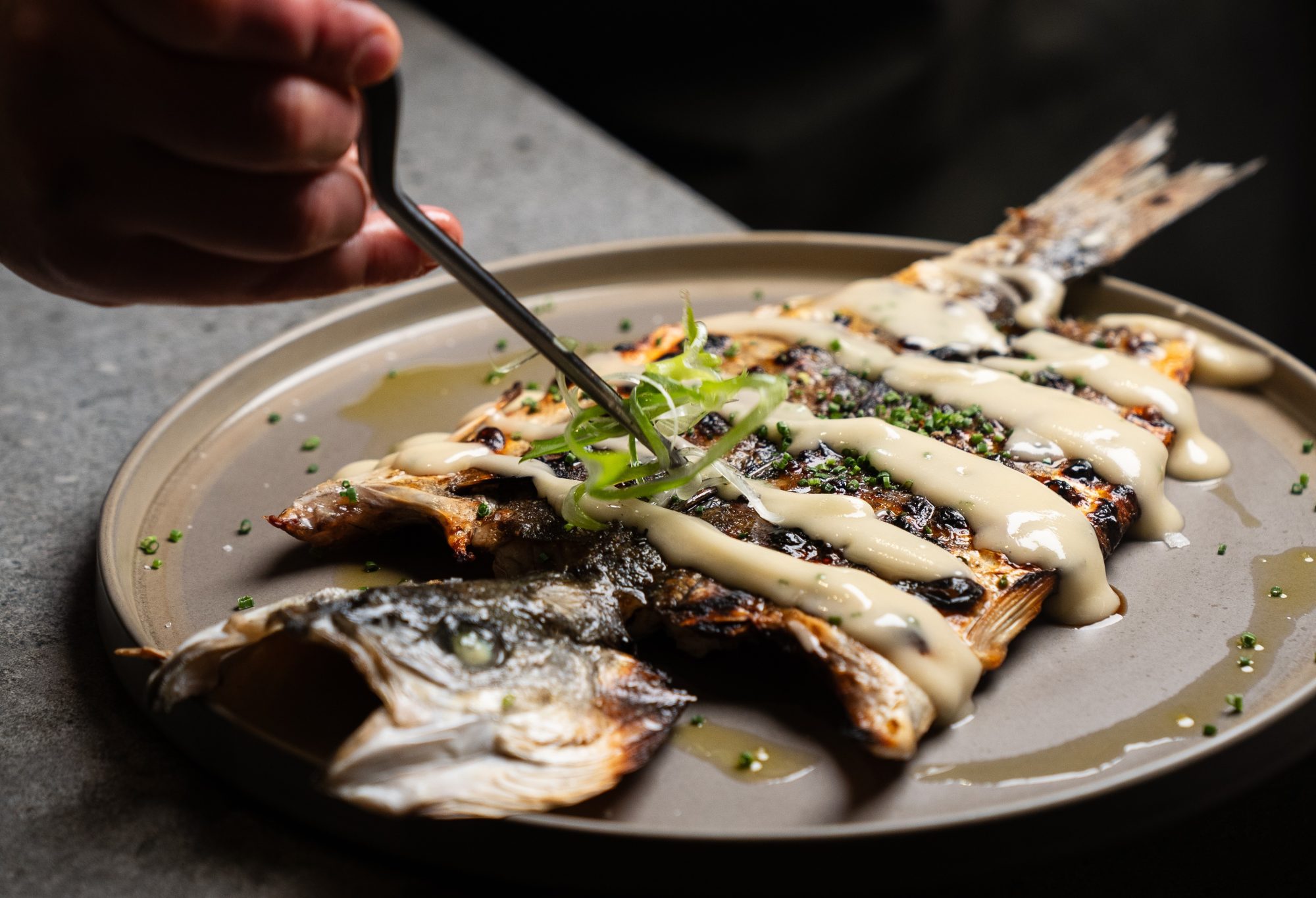 Hay algo mágico e hipnótico en observar cómo trabajan. Los cuchillos afilados y precisos están a la vista. La limpieza del pescado se lleva a cabo delante del comensal con meticulosidad quirúrgica. Y ahí es donde la influencia asiática no es solo estética. El pescado, por ejemplo, no se cocina sin más: se limpia con precisión extrema, se somete a un proceso de secado de varios días y se lleva a la brasa durante apenas unos minutos. El resultado es una textura firme, el sabor concentrado e intervención mínima.
